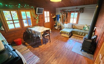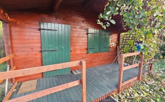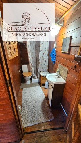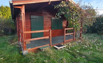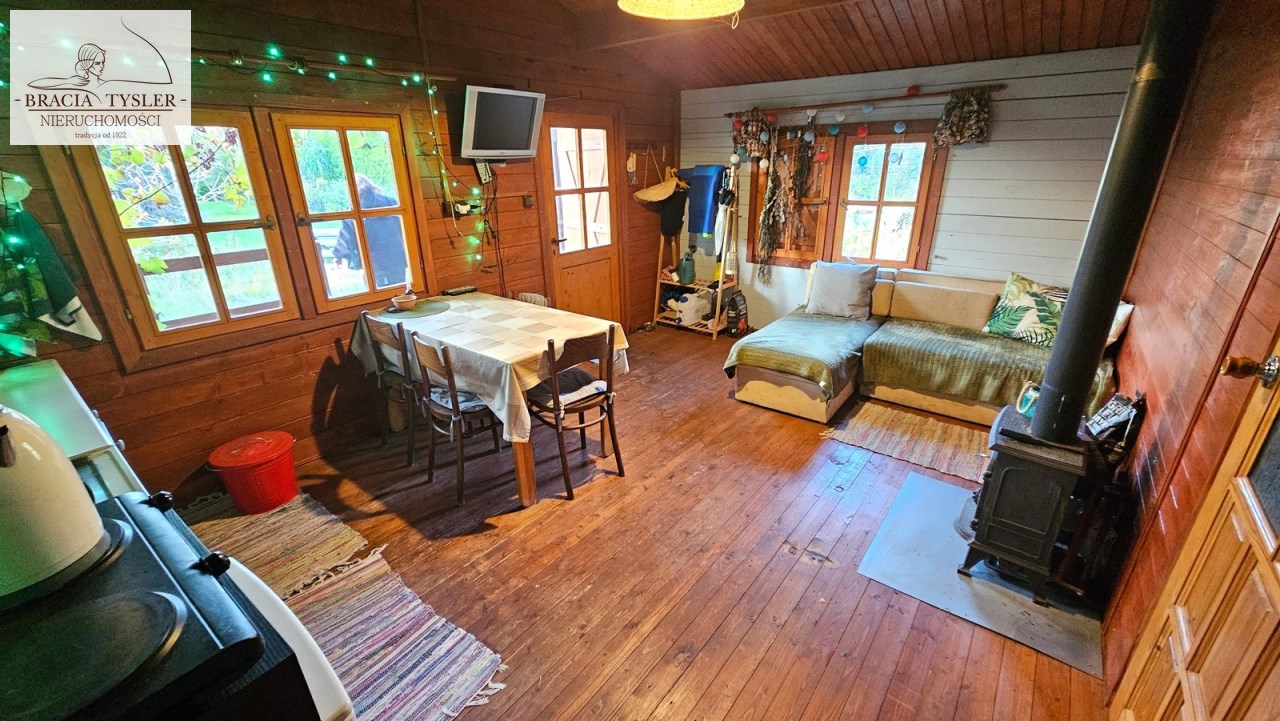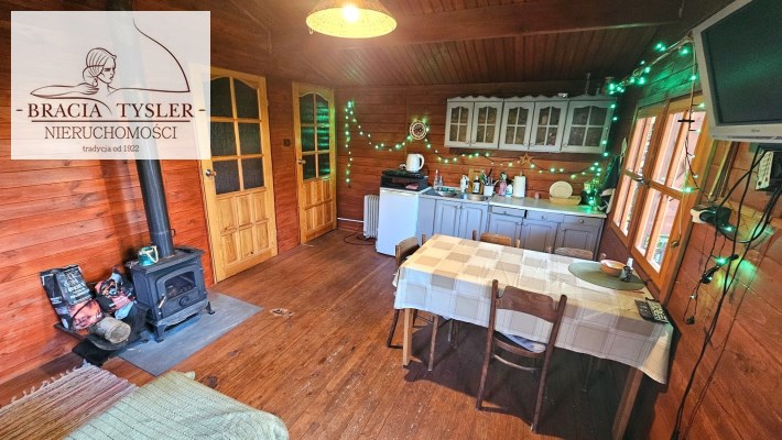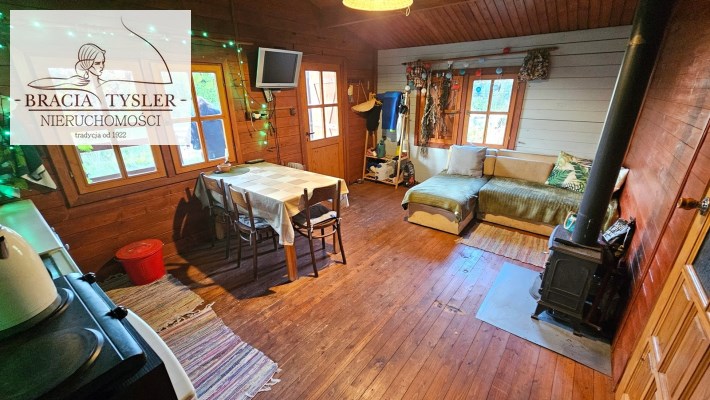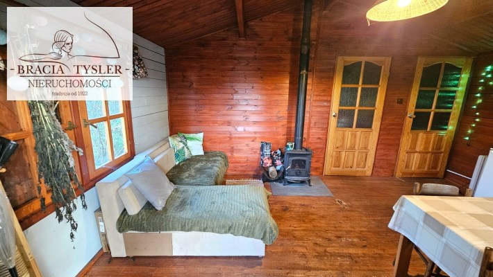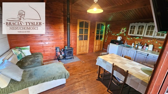 Domek w całości drewniany. Jest wykonany bardzo starannie. Do zamieszkania od zaraz. Dach pokryty blachodachówką. Ściany wykonane z belek drewnianych. Nowe okna drewniane z okiennicami. Rynny PCV. Prąd, woda miejska. Cały rok. Duże szambo na działce. Działka w całości ogrodzona płotem z siatki. Zagospodarowana. Ogrzewanie - Kominek (koza) i piecyk gazowy. Duży taras. Na działce posadzone drzewa, krzewy ozdobne. Czereśnie, jabłoń, winogrono, borówki, maliny, jeżyny. Możliwość wjazdu autem na teren działki. Blisko nad jezioro i las. Wyposażenie w cenie. Meble kuchenka elektryczna, lodówka, piecyk gazowy. zlew. Pokój z aneksem kuchennym, oddzielna sypialnia, łazienka z WC i prysznicem, umywalka, pogrzewacz wody. Na podłogach deski. W domku stół, krzesła, łóżko, kominek.